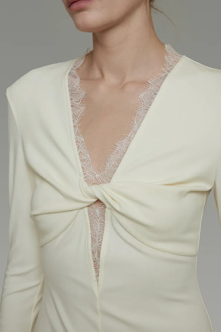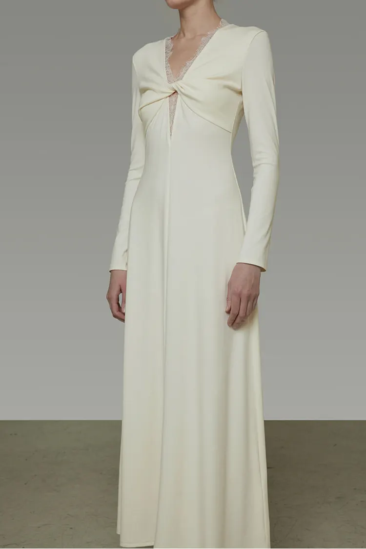 V넥의 레이스는 깔끔한 잠금 스티치로 꼼꼼하게 손으로 고정되어 드레스 실루엣과 완벽하게 조화를 이룹니다.