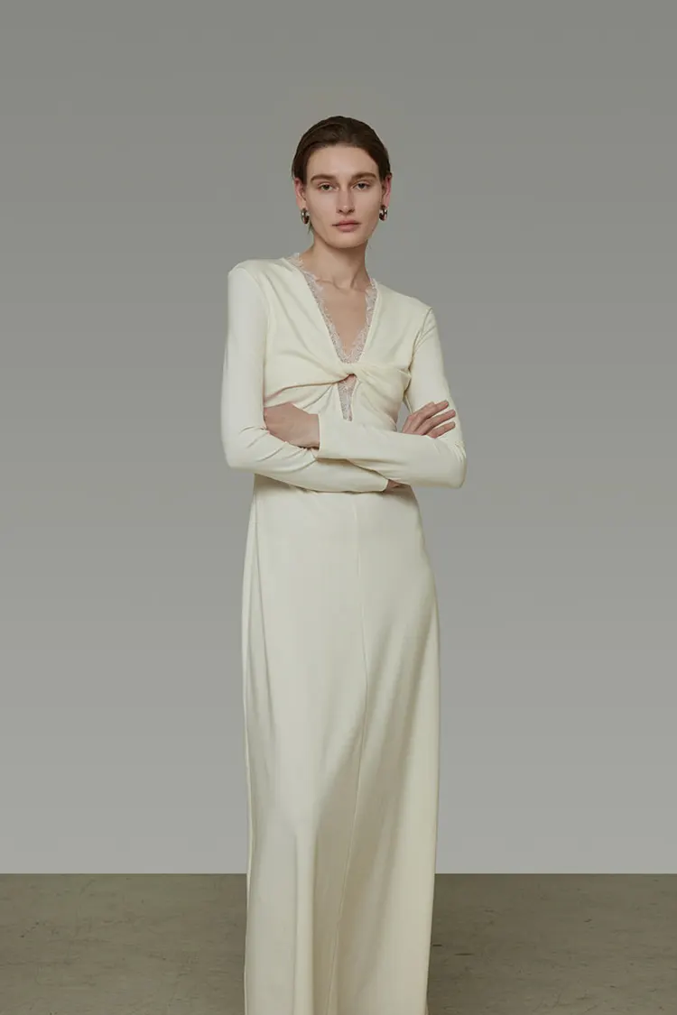 여성 봄 신상품 - 매듭 V 넥 레이스 스플라이스 맥시 드레스, 슬림 핏 & 몸매 돋보임