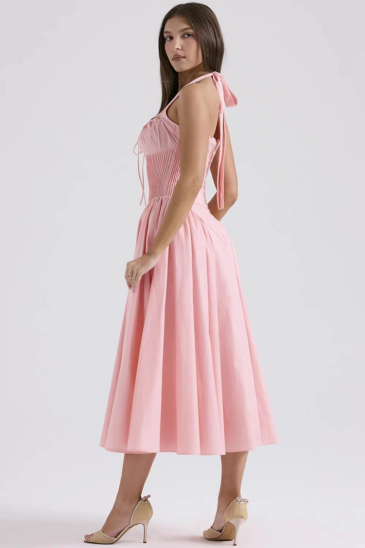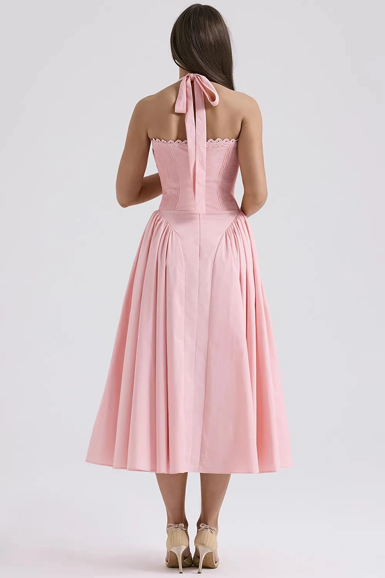 부드럽고 몽환적인 피치 핑크 컬러가 피부 자극을 주지 않는 부드러운 톤이 특징인 여성용 핑크 코튼 미디 드레스입니다. 효과적으로 안색을 밝혀주어 로맨틱하고 발랄한 분위기를 연출해줍니다. 동시에 복고풍의 우아함과 현대적인 패션 요소를 결합했습니다. 네크라인의 넥타이는 자유롭게 조이거나 풀 수 있어 섬세한 어깨와 목 라인을 능숙하게 윤곽을 잡아주어 풍성한 분위기를 연출할 수 있습니다. 윗부분의 피쉬본 웨이스트 디자인이 몸에 잘 밀착되어 압박감이 심하지 않습니다. 허리와 복부 곡선을 강조해 체형을 은은하게 슬림하게 만들 수 있습니다. 양쪽 플리츠로 허리와 복부의 잔지방을 감출 수 있어 다양한 체형에 매우 친화적입니다. 미디기장의 스타일과 슬리브리스 디자인이 결합되어 보행 시 부드럽고 가벼우며 날렵한 라인을 선사합니다. 원단 자체의 강성은 피시본 디자인을 잘 지지하여 부드러워지거나 변형되는 것을 방지하고 아름다움과 편안함의 균형을 유지합니다.